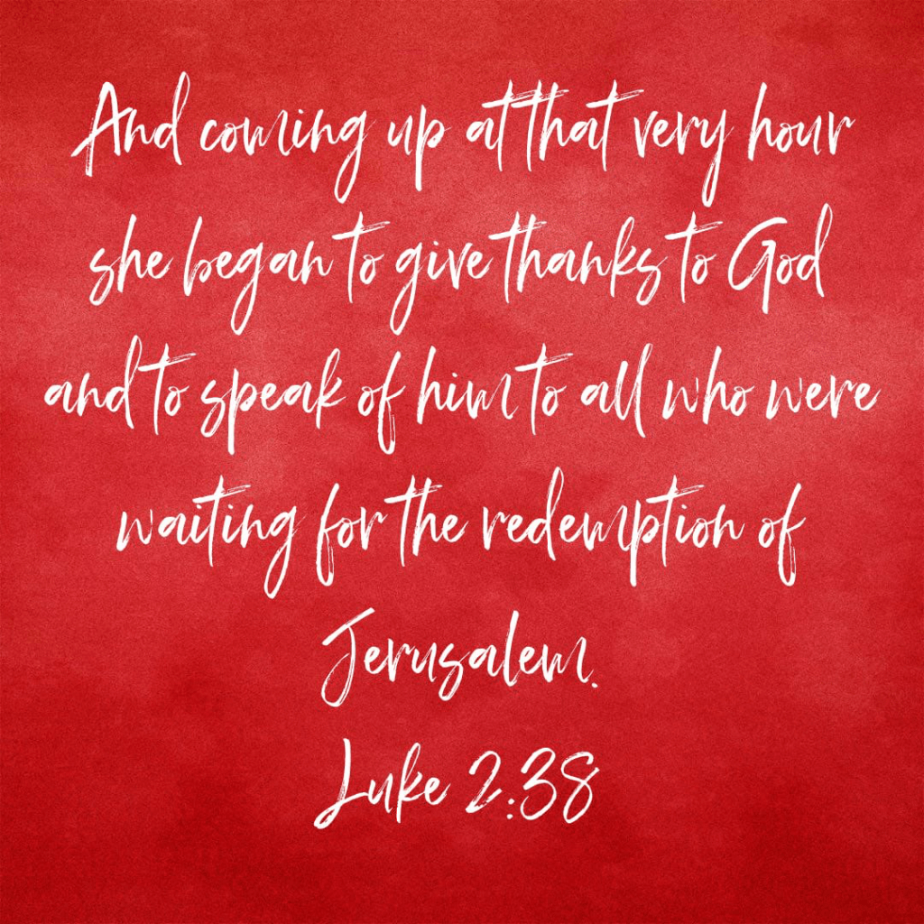 36 And there was a prophetess, Anna, the daughter of Phanuel, of the tribe of Asher. She was advanced in years, having lived with her husband seven years from when she was a virgin, 37 and then as a widow until she was eighty-four. She did not depart from the temple, worshiping with fasting and prayer night and day. 38 And coming up at that very hour she began to give thanks to God and to speak of him to all who were waiting for the redemption of Jerusalem. Luke 2: 36-38