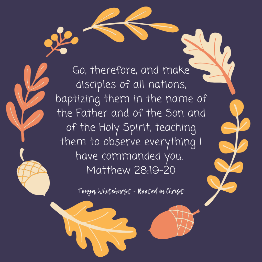 Go, therefore, and make disciples of all nations, baptizing them in the name of the Father and of the Son and of the Holy Spirit, teaching them to observe everything I have commanded you. Matthew 28:19-20